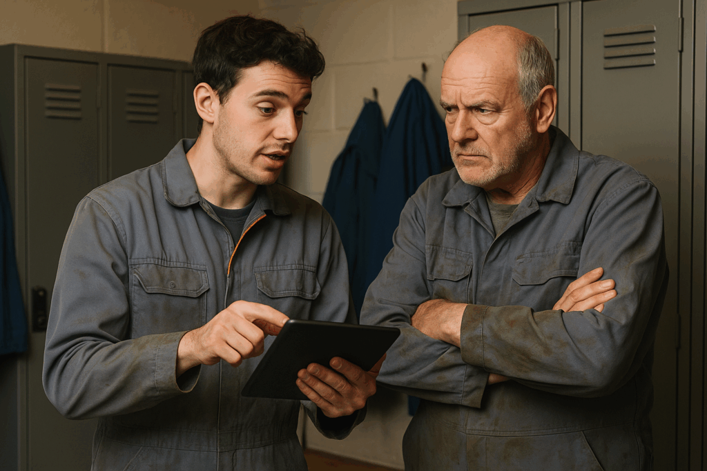 Spogliatoio, fine turno. Due manutentori si cambiano: uno giovane, con il tablet sotto braccio,...