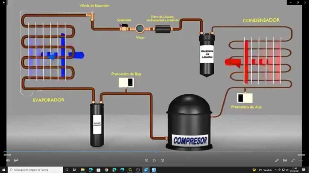 • Compressione: il fluido refrigerante, in forma gassosa ed a bassa pressione e temperatura, entra nel compressore, dove viene compresso allo stato liquido aumentano pressione e temperatura, e cambiando stato da gassoso a liquido.