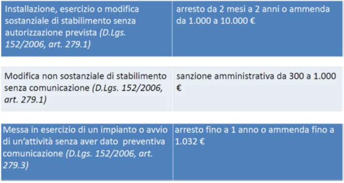 Se si attiva un’attività che prevede scarichi in ambiente (atmosfera e reflui) senza l’AUA in caso di controllo da parte di un qualsiasi ente le sanzioni possono essere l’arresto da 2 mesi a 2 anni per reato ambientale, le sanzioni in base alla fonte di inquinamento generata e il fermo immediato dell’attività.